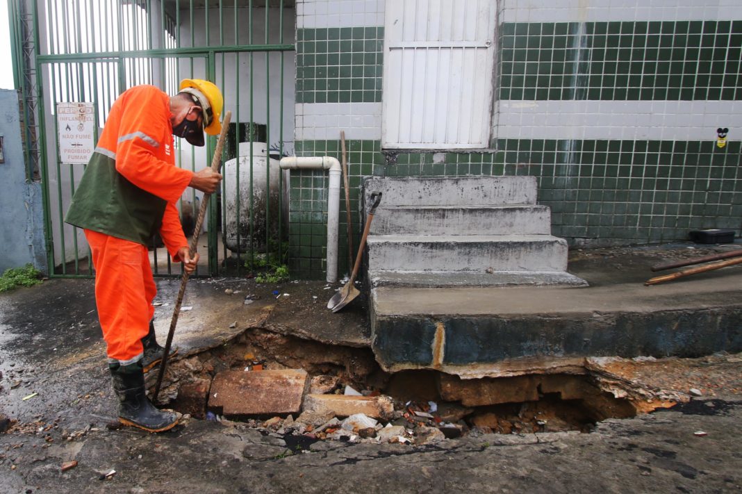 Devido às fortes chuvas que assolam Manaus, um trecho da tubulação sofreu o desanelamento dos tubos, impedindo a passagem correta das águas  pluviais, provocando uma erosão e o afundamento da via. Ao identificar o problema as equipes da Seminf atuaram de imediato, evitando assim um problema maior.