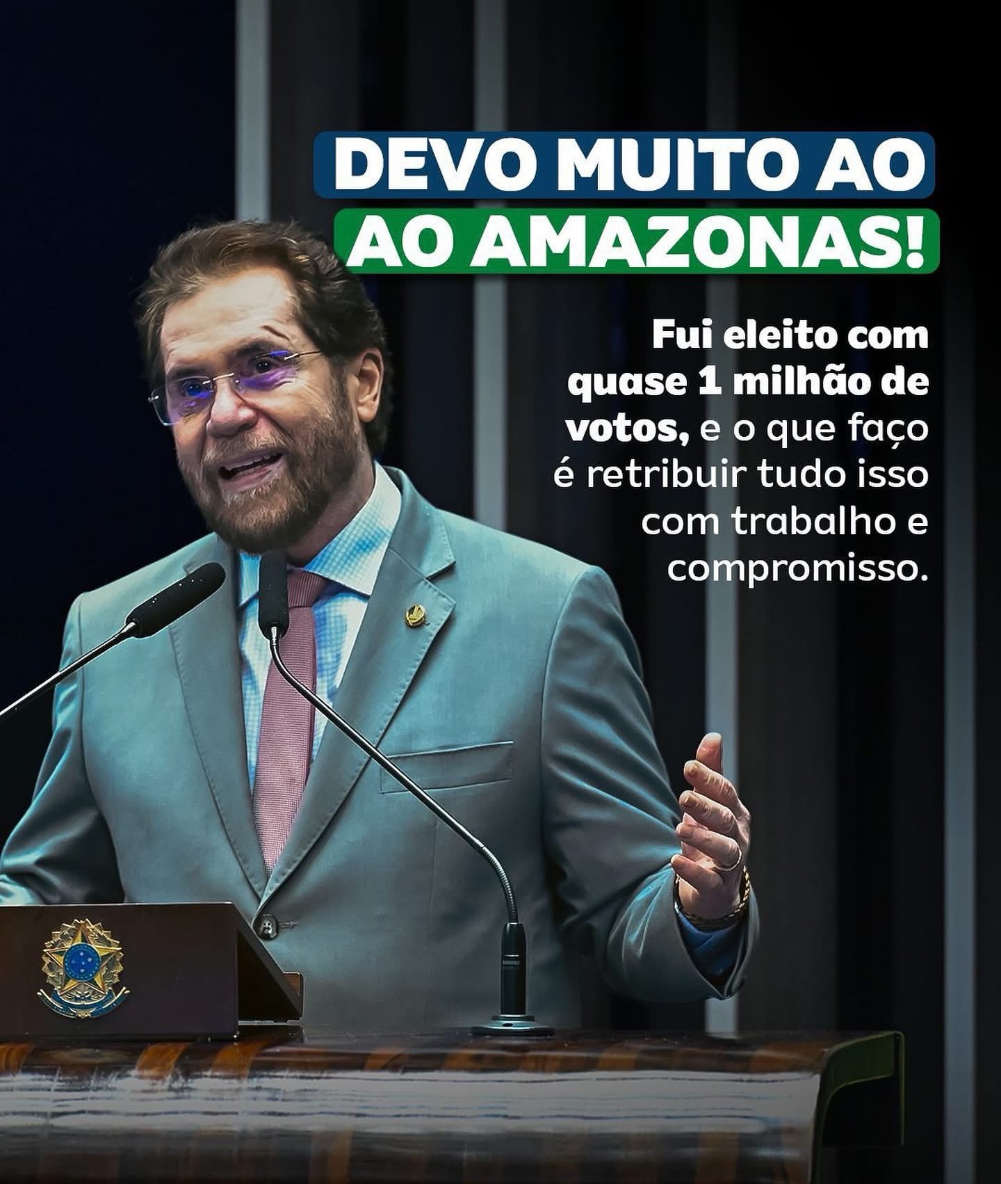 POLÍTICA- “Devo muito ao Amazonas. Retribuo toda essa confiança e carinho todos os dias: denunciando injustiças, estando ao lado do povo que vive isolado e precisa de uma BR que não sai do papel por falta de vontade política; destinando recursos do povo para o povo, por meio de emendas nas áreas de saúde, educação e infraestrutura; e criando e aprovando leis que fazem a diferença na vida das pessoas.
