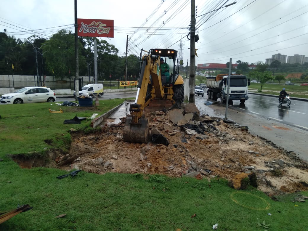A estrutura e o piso de uma borracharia e lava a jato construídos irregularmente em um canteiro central na avenida das Torres com a avenida Natan Xavier, no Novo Aleixo, zona Norte, foi demolida, nesta quarta-feira (20), durante ação integrada da Prefeitura de Manaus.