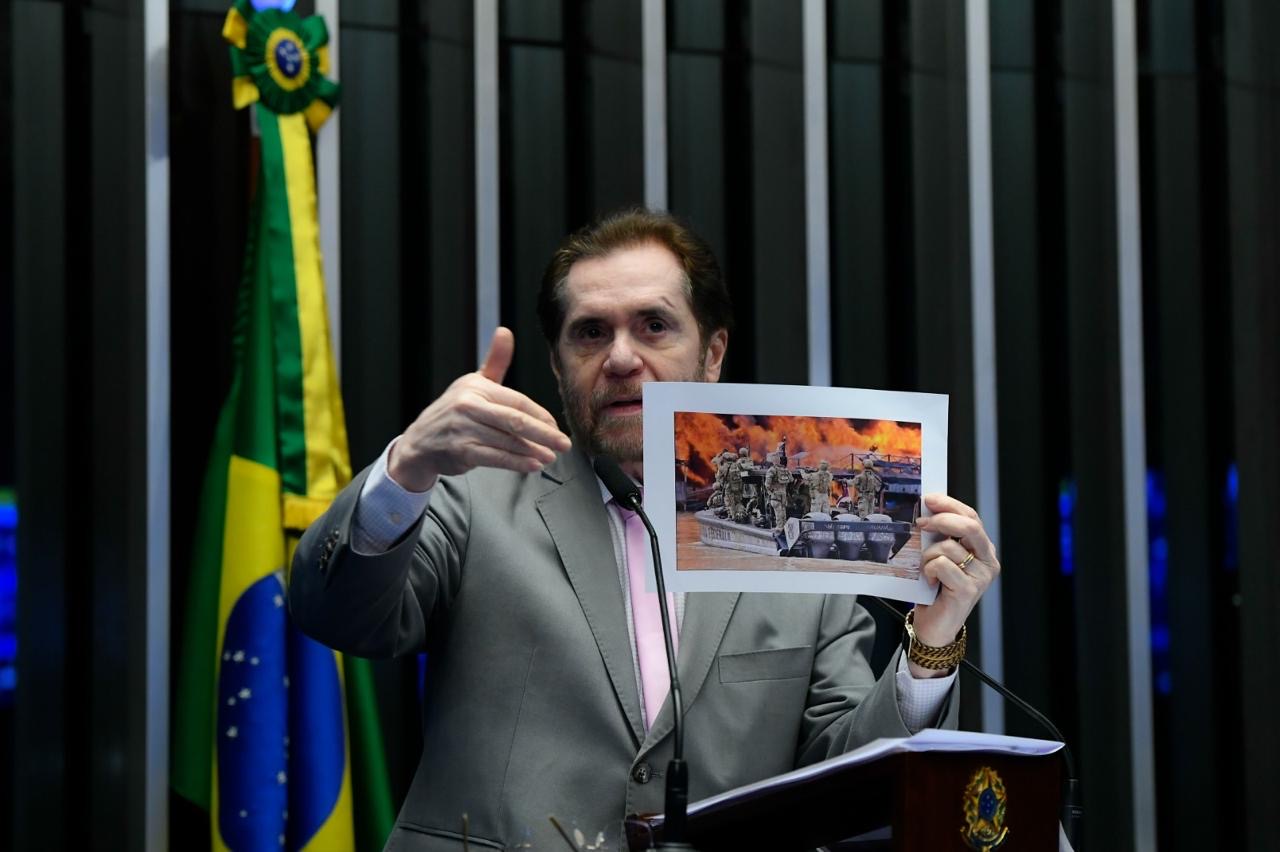 POLÍTICA- Exibindo vídeos e imagens chocantes da operação da Polícia Federal com forte aparato de helicópteros e barcos despejando chuva de bombas para explodir flutuantes no porto de Manicoré, o senador Plínio Valério (PSDB-AM) protestou hoje na Comissão de Infraestrutura e na tribuna do Senado contra o terror que está deixando em pânico moradores e crianças das escolas. Com o apoio de todos os senadores, a pedido de Plínio como primeiro signatário, a Comissão de Infraestrutura encaminhará ao Ministério da Justiça ofício para que explique o motivo e quem autorizou a operação que, a pretexto de combater o crime organizado, deixou sem teto famílias de trabalhadores de cooperativas com CNPJ que , pela Constituição, tem direito de fazer o extrativismo mineral artesanal.