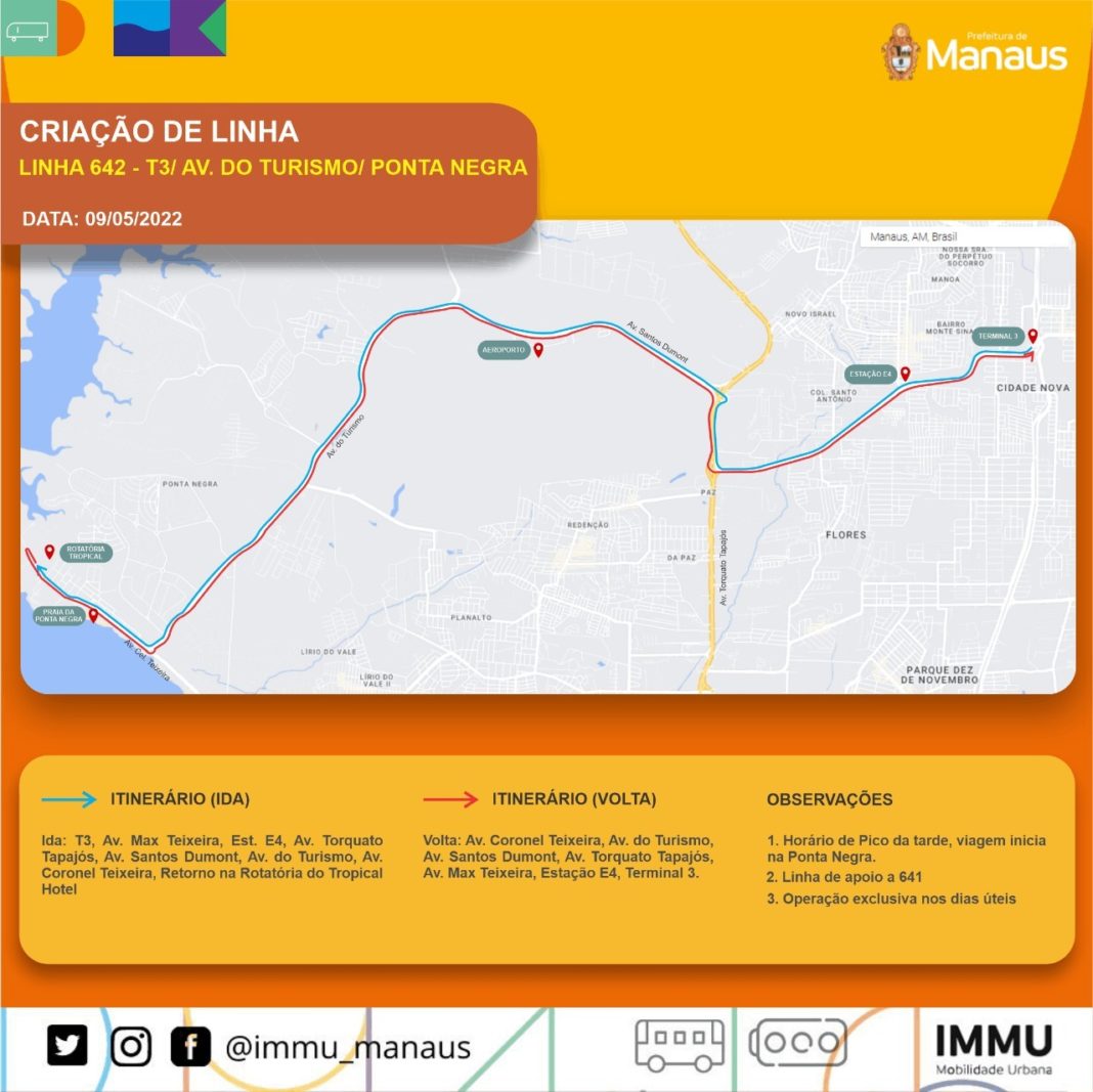A partir da próxima segunda-feira (9), a Prefeitura de Manaus, por meio do Instituto Municipal de Mobilidade Urbana (IMMU), coloca em operação uma nova linha de ônibus, a 642 – T3/Avenida do Turismo/Ponta Negra, que irá reforçar o itinerário da linha 641 – T4 – T3 – aeroporto – Ponta Negra.