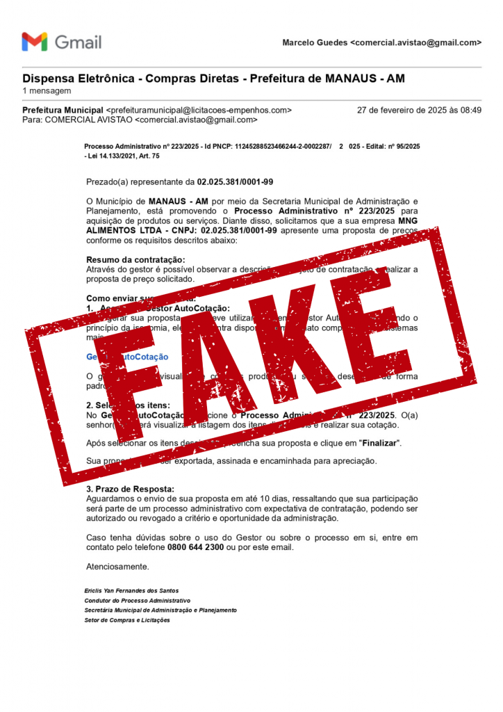 MANAUS- A Prefeitura de Manaus alerta para falso e-mail que está sendo enviado a empresas utilizando o nome da Secretaria Municipal de Administração, Planejamento e Gestão (Semad). A referida mensagem, oriunda de domínio inexistente na administração municipal (prefeituramunicipal@licitacoes-empenhos.com), indica um link clicável, recurso utilizado para a captura de dados, configurando phishing, um tipo de cibercrime que consiste em tentar obter informações pessoais de forma ilegal.