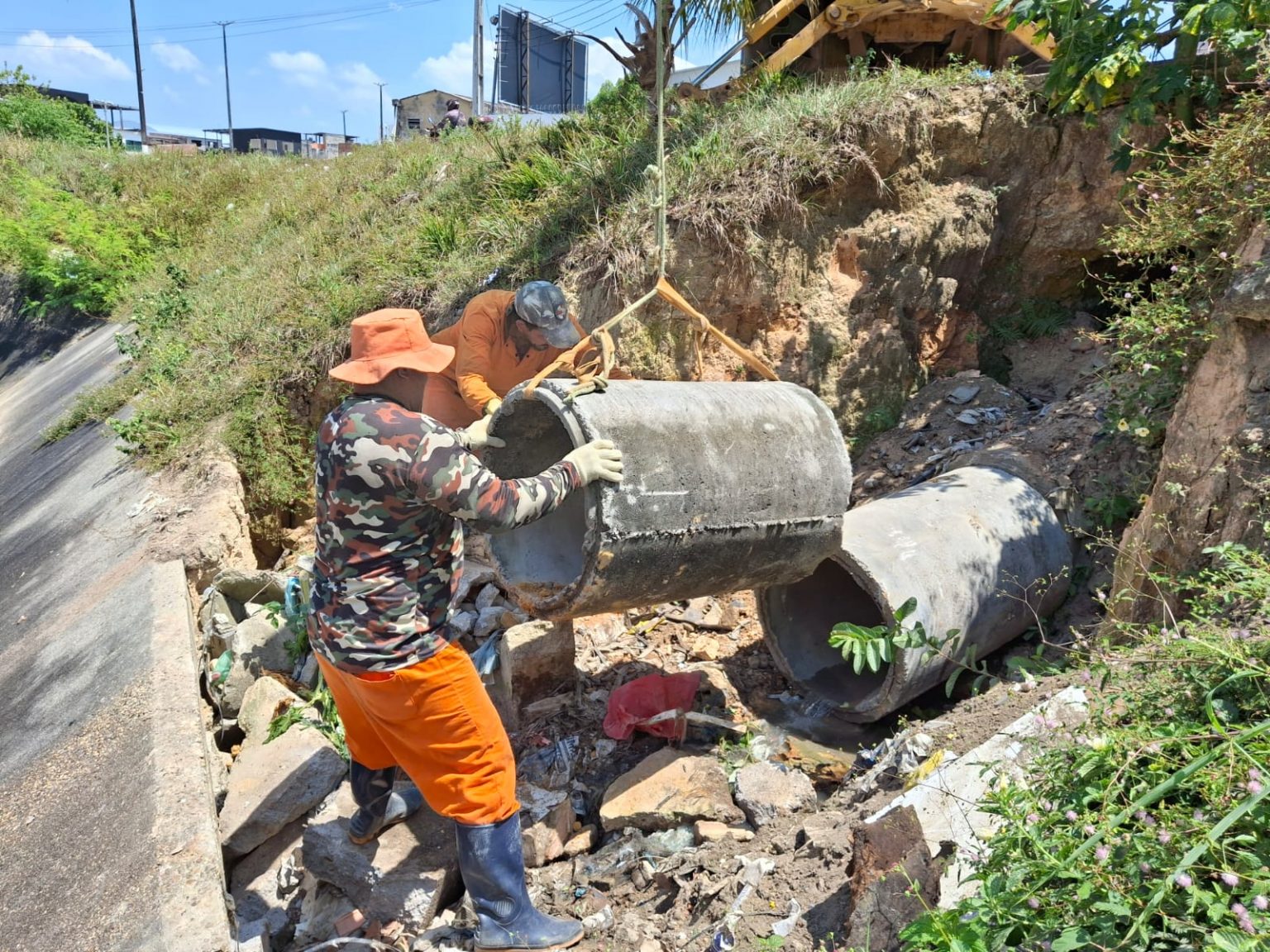 MANAUS- A Prefeitura de Manaus, por meio da Secretaria Municipal de Infraestrutura (Seminf), iniciou, nesta quinta-feira, 11/9, a implantação de novos tubos no sistema de drenagem da rua Aires da Cunha, no bairro Alvorada. A intervenção é executada no talude de um igarapé que sofreu desbarrancamento e acabou comprometendo a galeria da área.