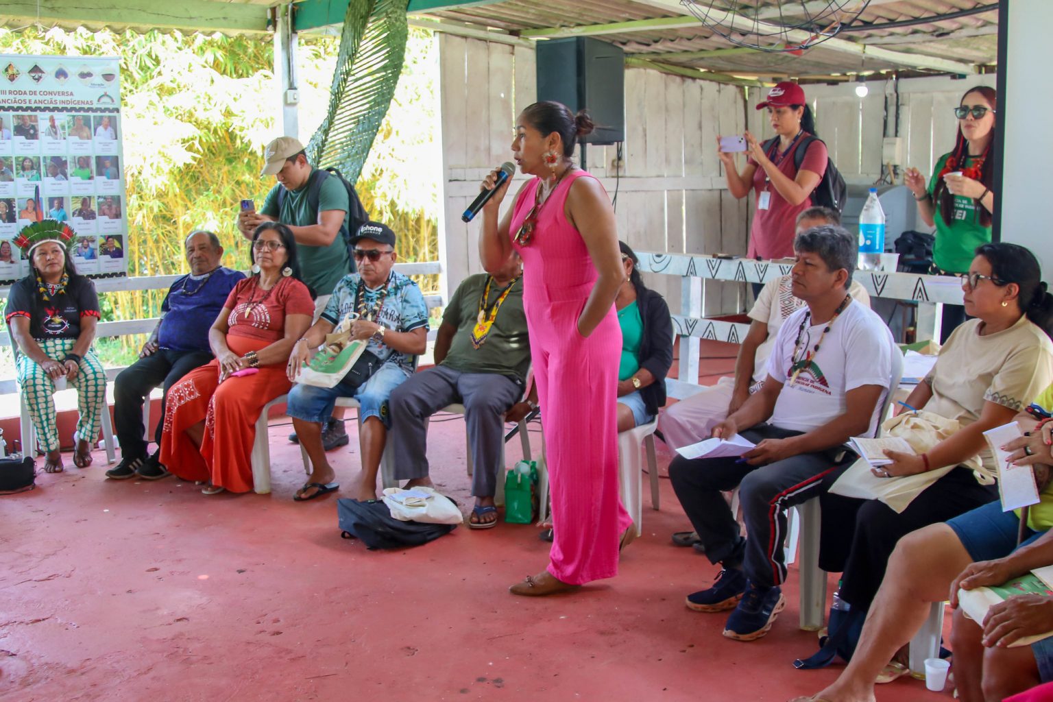 A programação contou com a apresentação do Hino Nacional na Língua Nheengatu, pelos alunos da escola indígena municipal Arú Waimi, seguido da tradicional Dança do Chibé, realizada pelo Grupo Mirim da Kunyata Putira. O momento cultural emocionou os presentes e reforçou o compromisso da comunidade com a valorização das tradições. O ponto alto da manhã foi a roda de conversa, que trouxe como tema “A importância do protagonismo dos anciãos na revitalização da Língua Materna”.